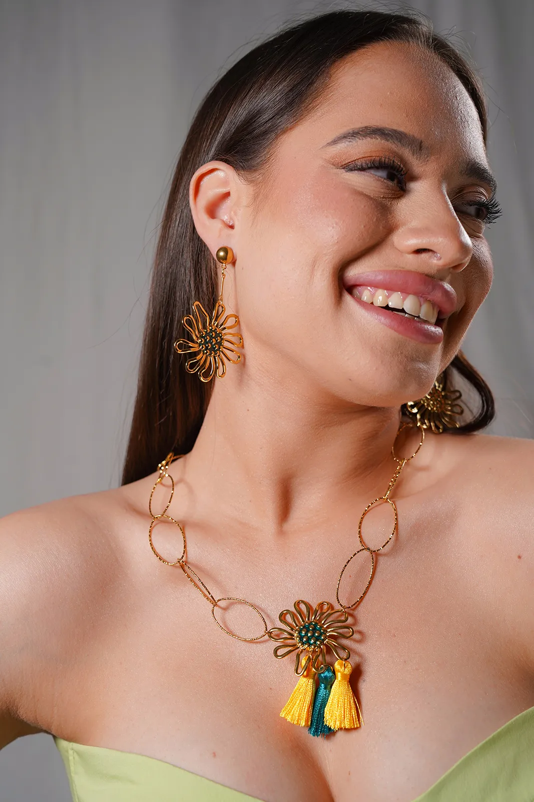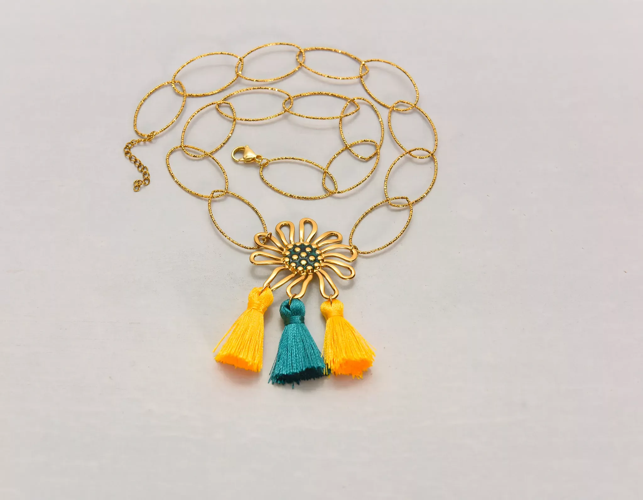 - Υλικό: ατσάλινη αλυσίδα, μεταξωτά φουντάκια, ατσάλινα στοιχεία
